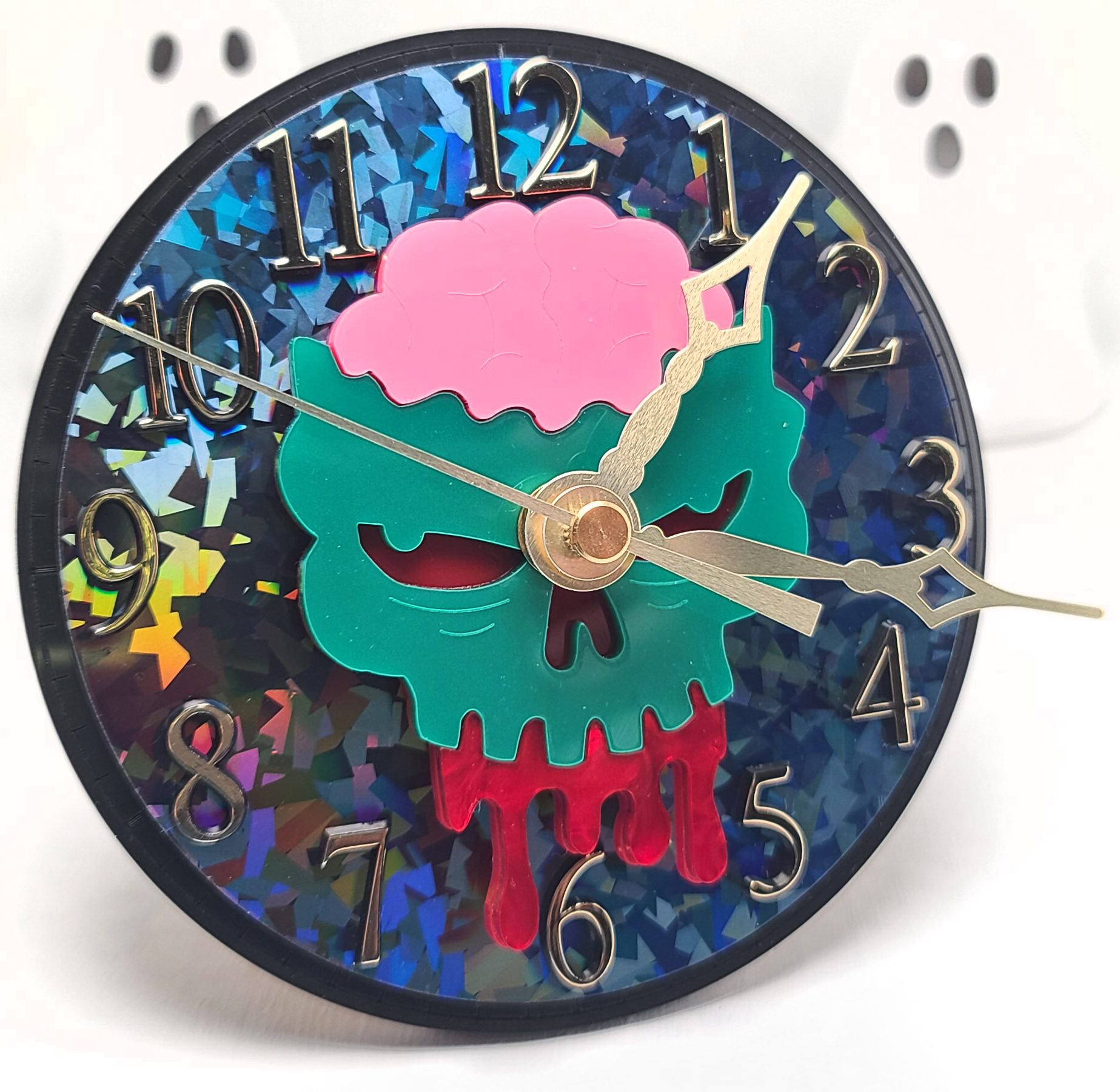 This zombie clock stands at just over 4 inches and is constructed of layered acrylic, wood, and metal timepieces. It’s always time for Horror when you have one of these. A great gift for a horror fan who has everything! Designed and handcrafted in Illinois. Shipping & handling included for orders within the United States. International orders, please query before purchase. Requires one AA battery.